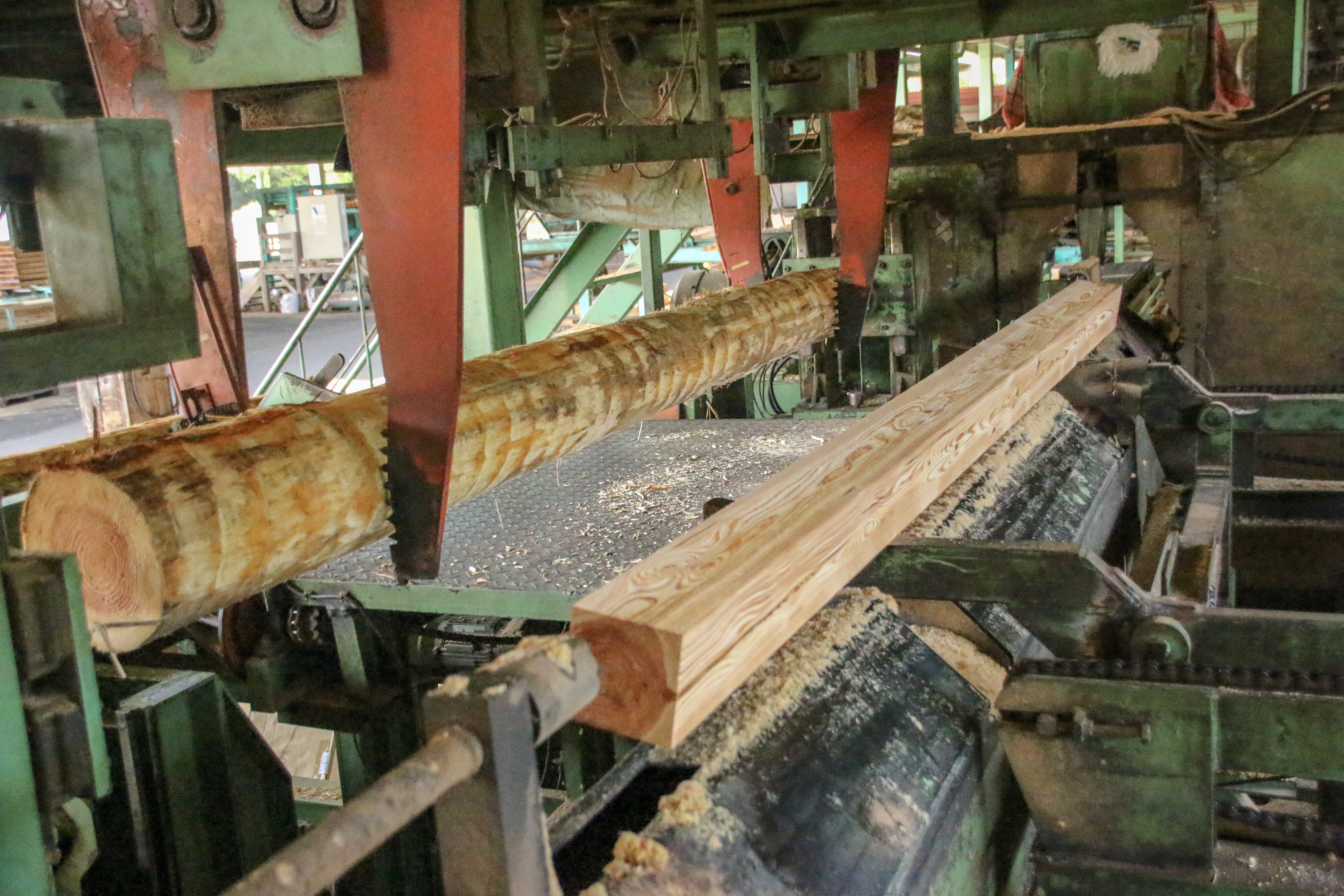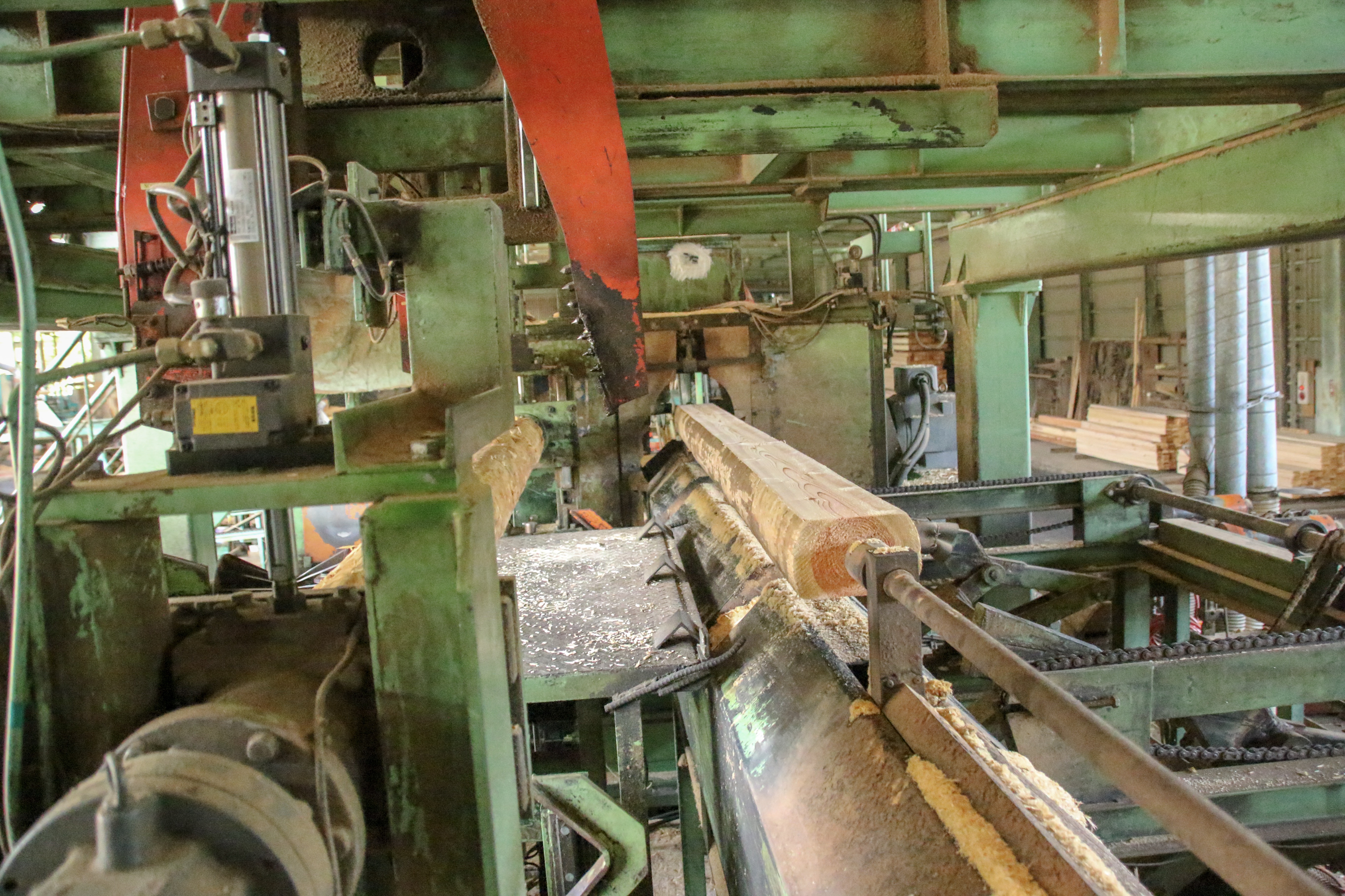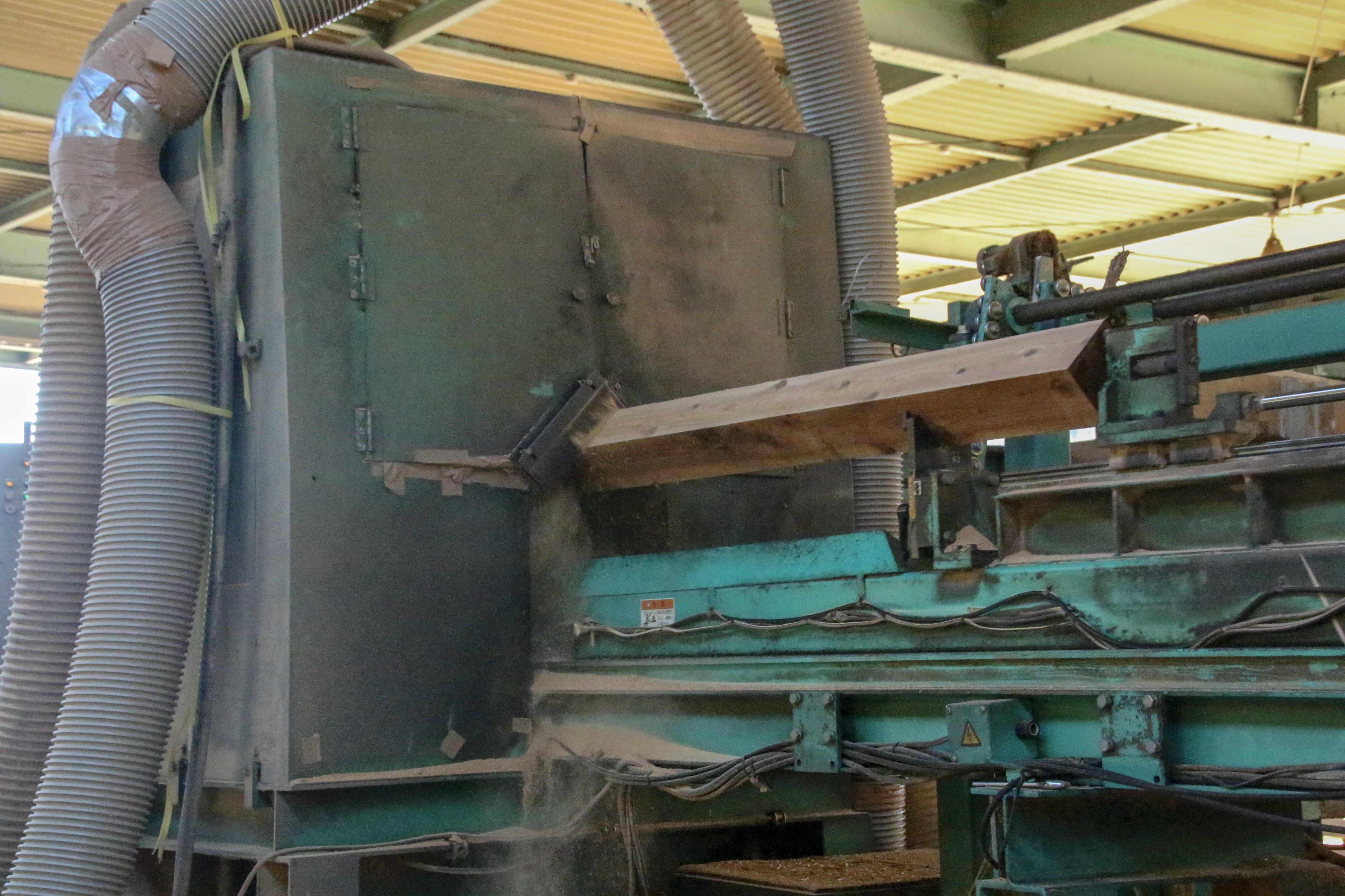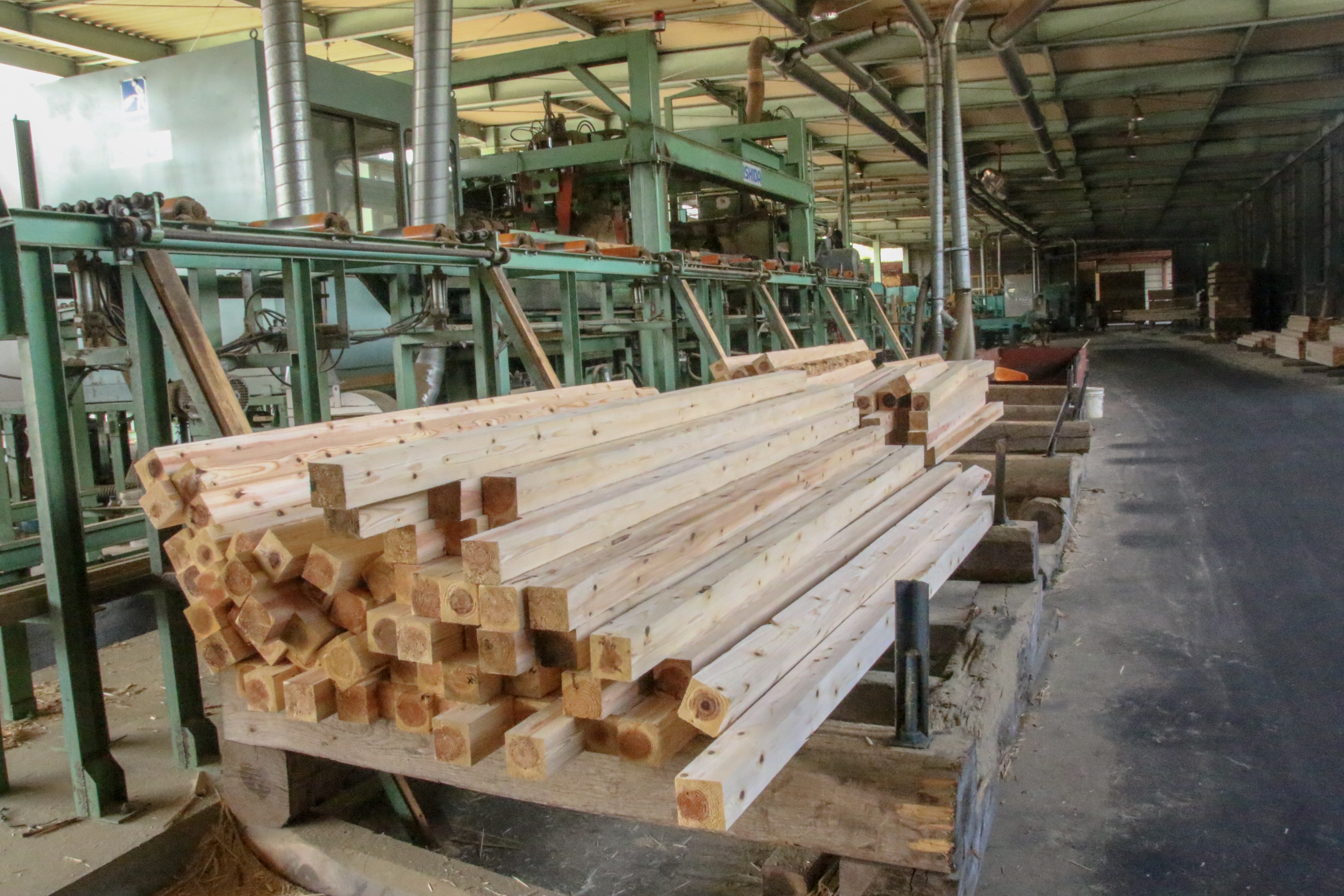 Vカット修正挽機(直角2面修正挽丸鋸ツインソー) 従来よりも抜群の直線精度 当社では従来品(モルダー仕上げのみ)よりも大幅な直線精度を向上させるため、全国初となる『直角2面修正丸鋸ツインソー(Vカット機)』をメーカーとともに共同開発いたしました。 ノーマン式丸鋸ツインソー(全自動丸鋸式製材機) 全自動により生産性を向上 石田エンジニアリング(静岡県)【※現在はオーアイ・イノベーション】で開発した『ノーマンツイン丸鋸』を、全国に先駆けいち早く導入しました。全自動による品質に優れた母屋角・柱角の生産量向上につながります。